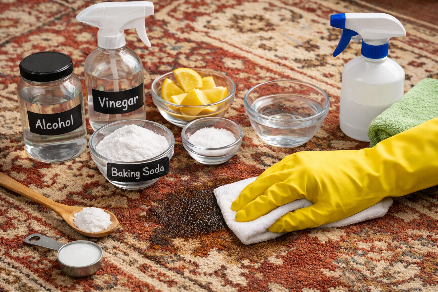 الکل سفید یا الکل طبی برای لکههای خاص مثل جوهر، ماژیک یا لاک ناخن کاربرد دارد. در این روش باید مقدار کمی الکل را روی پنبه یا دستمال بریزید و خیلی آرام روی لکه ضربه بزنید. استفاده بیشازحد از الکل ممکن است رنگ فرش را تغییر دهد، بنابراین تست کردن آن روی قسمت کوچکی از فرش قبل از استفاده اصلی، ضروری است.